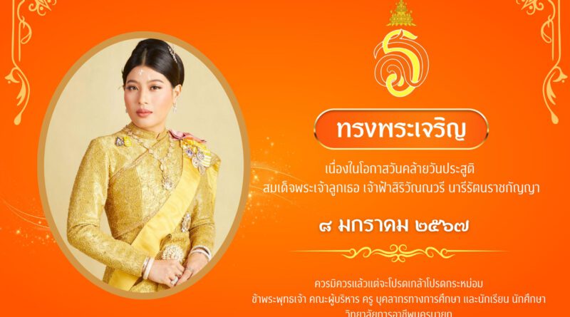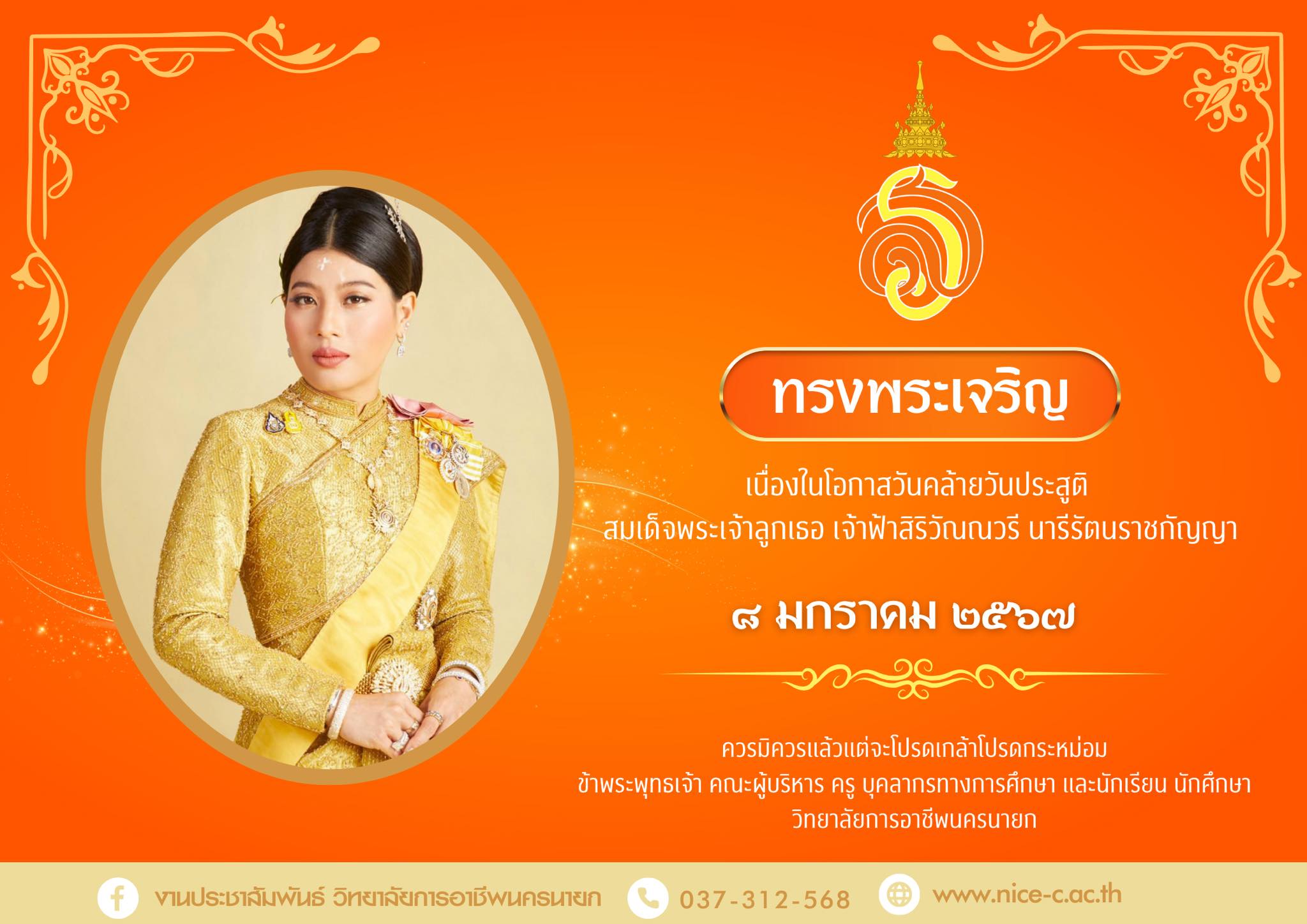 เนื่องในโอกาสวันคล้ายวันประสูติ สมเด็จพระเจ้าลูกเธอ เจ้าฟ้าสิริวัณณวรี นารีรัตนราชกัญญา น้อมสำนึกในพระมหากรุณาธิคุณเป็นล้นพ้นอันหาที่สุดมิได้ ข้าพระพุทธเจ้า คณะผู้บริหาร คณะครู บุคลากรทางการศึกษา และนักเรียน นักศึกษา วิทยาลัยการอาชีพนครนายกวิทยาลัยการอาชีพนครนายก ขอเชิญชวนร่วมลงนามถวายพระพร สมเด็จพระเจ้าลูกเธอ เจ้าฟ้าสิริวัณณวรี นารีรัตนราชกัญญา เนื่องในโอกาสวันคล้ายวันประสูติ วันที่ 8 มกราคม 2567 ผ่านระบบออนไลน์ ราชการในพระองค์