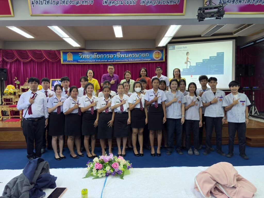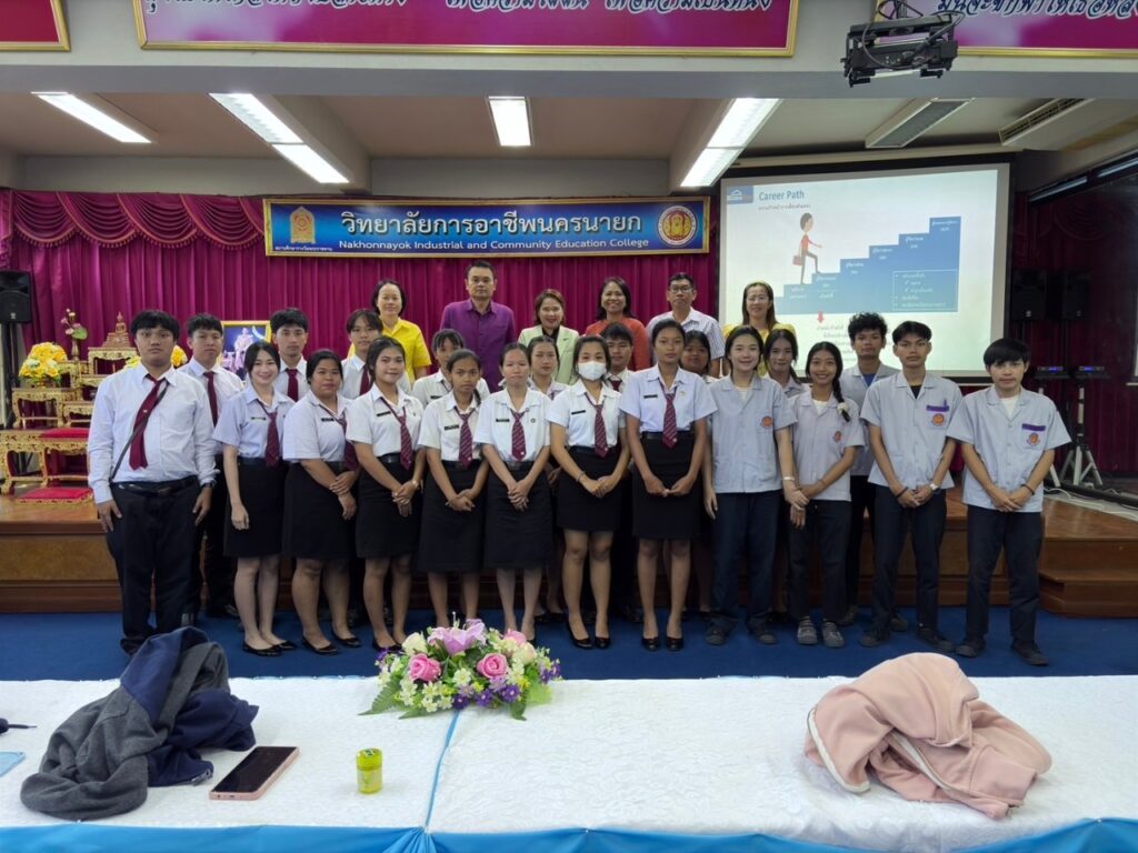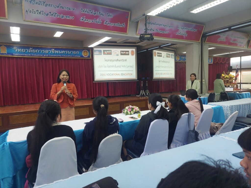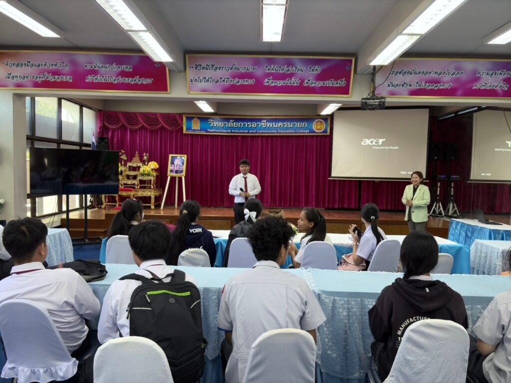 วันที่ 3 ธันวาคม 2567 นางสาวปานรดา มุ่งยุทธกลาง รองผู้อำนวยการฝ่ายวิชาการ พร้อมด้วย นางพัชรินทร์ วิลัยโรจน์ หัวหน้างานอาชีวศึกษาระบบทวิภาคี คณะครู และนักเรียน นักศึกษาสาขาวิชาเทคโนโลยีอิเล็กทรอนิกส์ และสาขาวิชาเทคโนโลยีธุรกิจดิจิทัล เข้าร่วมรับฟังแนะแนวโครงการทุนการศึกษาทวิภาคี การรับนักศึกษาฝึกอาชีพ สิทธิประโยชน์ที่นักศึกษาได้รับระหว่างการฝึก โดยบริษัท โฮม โปรดักส์ เซ็นเตอร์ จำกัด (มหาชน) ฝ่ายบริหารการศึกษา ณ ห้องเฟรนคอนเนอร์ อาคารวิทยบริการ วิทยาลัยการอาชีพนครนายก