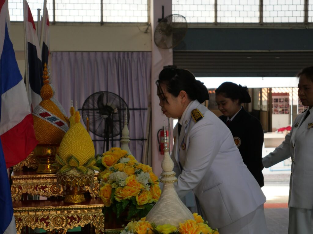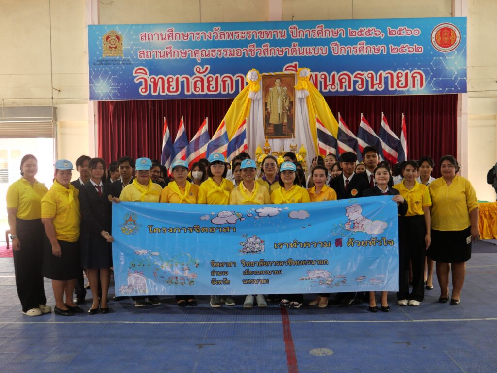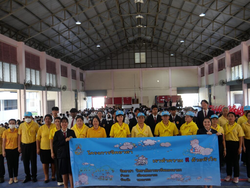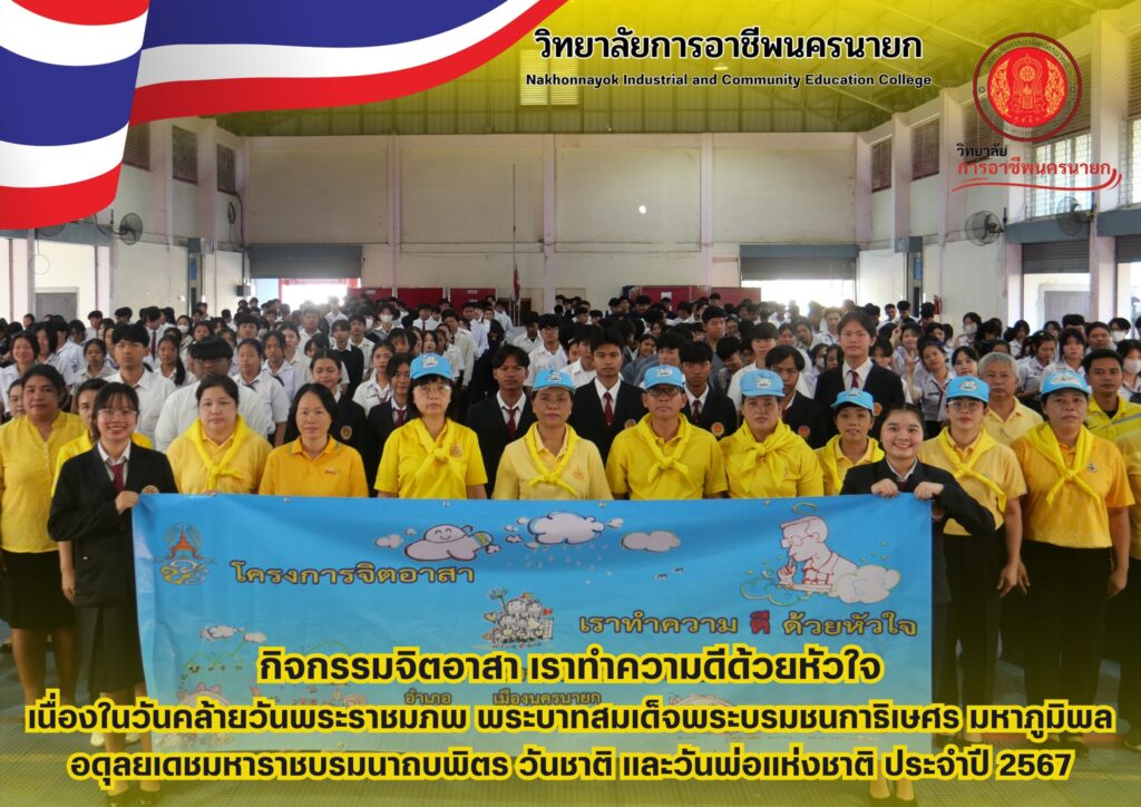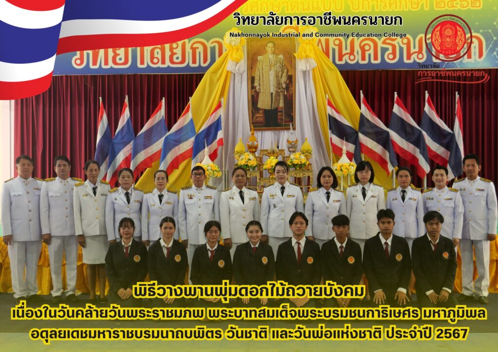 วันที่ 4 ธันวาคม 2567 นางศรัญญา สุขปลั่ง ผู้อำนวยการวิทยาลัยการอาชีพนครนายก พร้อมด้วย ผู้บริหาร คณะครู บุคลากรทางการศึกษา และนักเรียน นักศึกษา วิทยาลัยการอาชีพนครนายก ร่วมพิธีวางพานพุ่มดอกไม้ถวายบังคมเนื่องในวันคล้ายวันพระราชมภพ พระบาทสมเด็จพระบรมชนกาธิเษศร มหาภูมิพลอดุลยเดชมหาราชบรมนาถบพิตร วันชาติ และวันพ่อแห่งชาติ ประจำปี 2567 ณ อาคารกีฬาอเนกประสงค์ วิทยาลัยการอาชีพนครนายก และ กิจกรรมจิตอาสา เราทำความดีด้วยหัวใจ