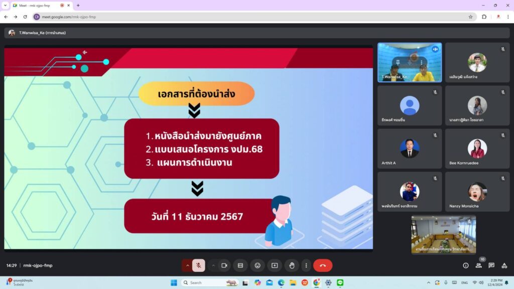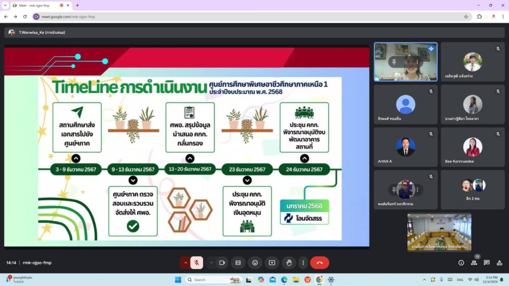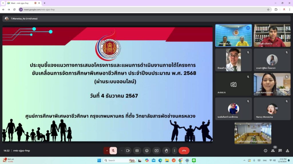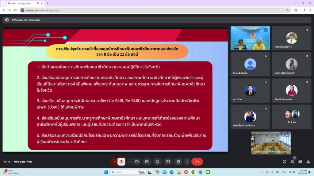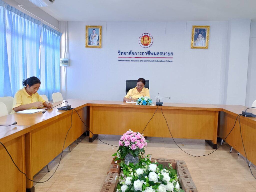 วันที่ 4 ธันวาคม 2567 นางสาวปานรดา มุ่งยุทธกลาง รองผู้อำนวยการฝ่ายวิชาการ พร้อมด้วย นางสาวฐิติมา ไชยอาลา หัวหน้างานอาชีวศึกษาคนพิการ วิทยาลัยการอาชีพนครนายก เข้าร่วมการประชุมชั้แจงแนวทางการเสนอโครงการและแผนการดำเนินงานภายใต้โครงการขับเคลื่อนการจัดการศึกษาพิเศษอาชีวศึกษา ประจำปีงบประมาณ 2568 โดยผ่าน Video Conference ณ ห้องประชุมจันทร์กระจ่างฟ้า วิทยาลัยการอาชีพนครนายก