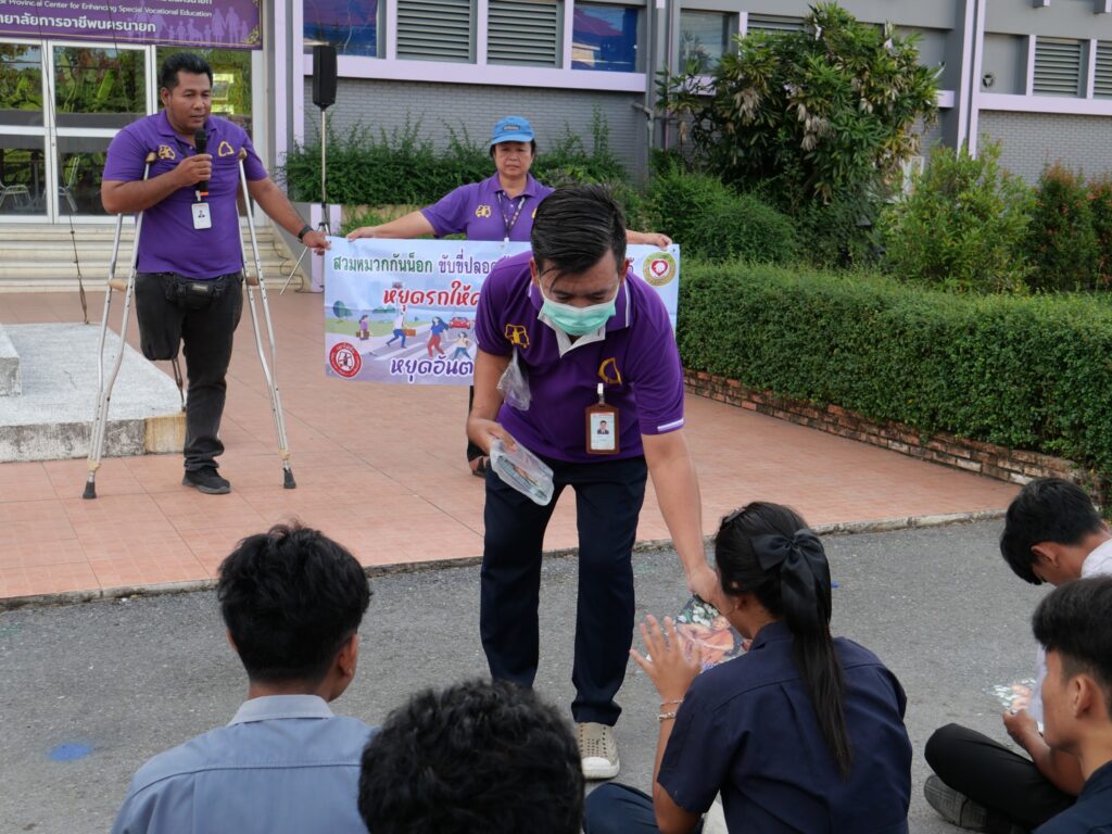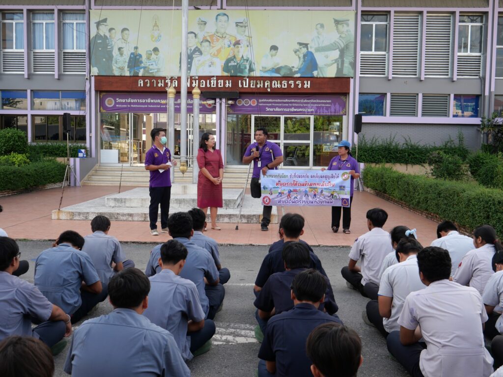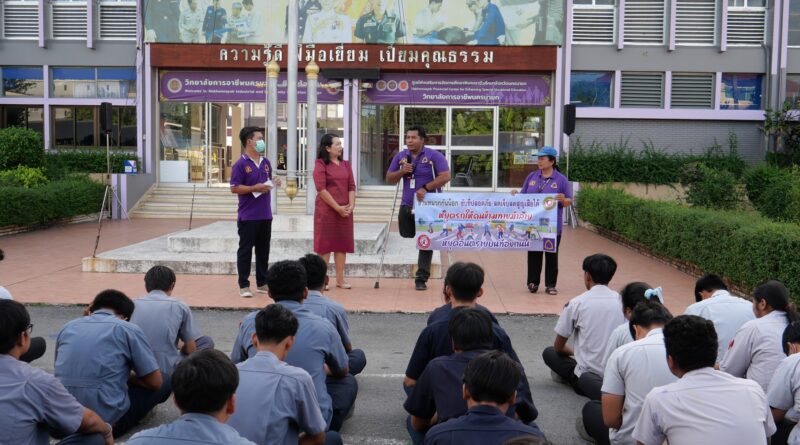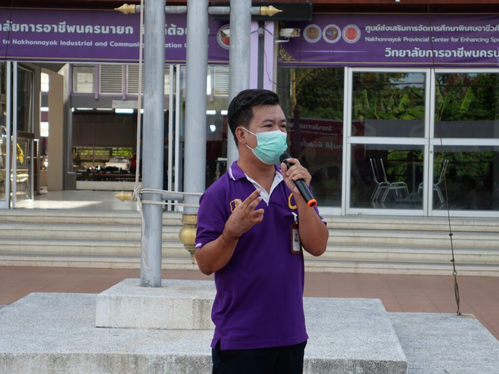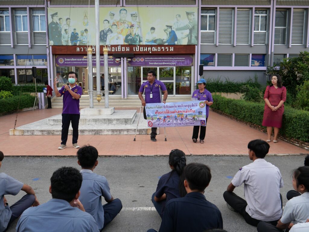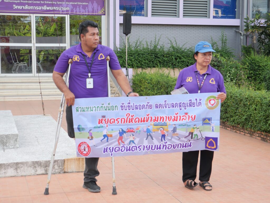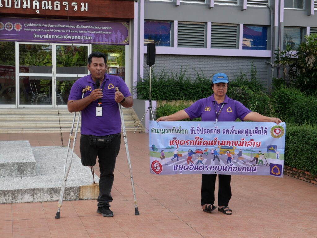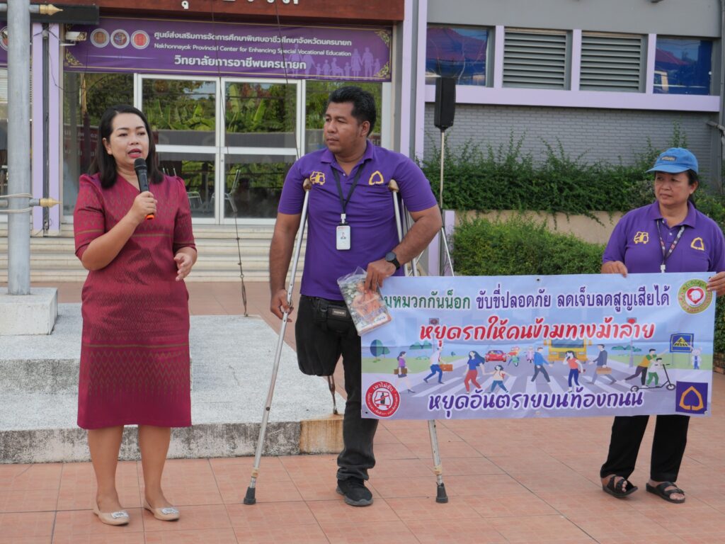นางศรัญญา สุขปลั่ง ผู้อำนวยการวิทยาลัยการอาชีพนครนายก พร้อมด้วย ผู้บริหาร คณะครู บุคลากรทางการศึกษา และนักเรียน นักศึกษา วิทยาลัยการอาชีพนครนายก ได้เข้าร่วมกิจกรรมให้ความรู้ “เรื่อง สวมหมวกกันน็อก ขับขี่ปลอดภัย ลดการเจ็บลดสูญเสียได้ หยุดอันตรายบนท้องถนน” เพื่อให้บุคลากร นักเรียน นักศึกษา มีความรู้ด้านความปลอดภัยอันตรายบนท้องถนน โดยสมาคมคนพิการ จังหวัดนครนายก ณ บริเวณหน้าเสาธง วิทยาลัยการอาชีพนครนายก