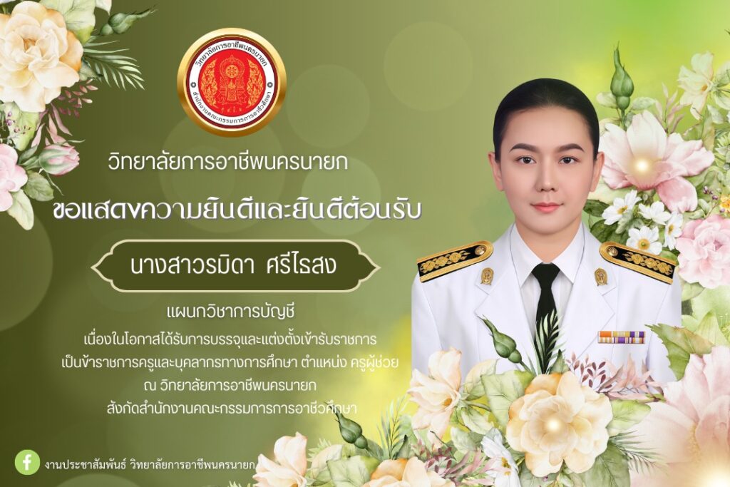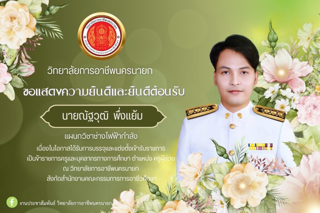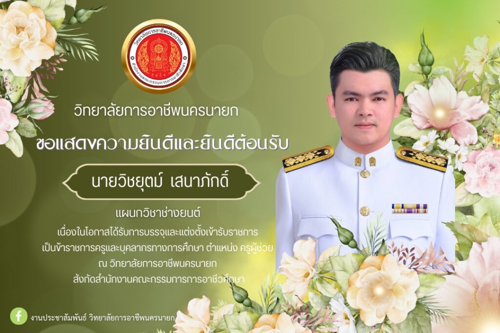 นายวิชยุตม์ เสนาภักดิ์ แผนกวิชาช่างยนต์ นายณัฐวุฒิ พึ่งแย้ม แผนกวิชาช่างไฟฟ้ากำลัง และนางสาวรมิดา ศรีไธสง แผนกวิชาการบัญชี เนื่องในโอกาสได้รับการบรรจุและแต่งตั้งเข้ารับราชการ เป็นข้าราชการครูและบุคลากรทางการศึกษา ตำแหน่ง ครูผู้ช่วย ณ วิทยาลัยการอาชีพนครนายก สังกัดสำนักงานคณะกรรมการการอาชีวศึกษา