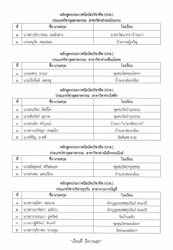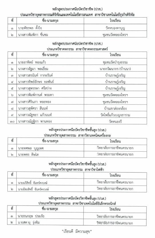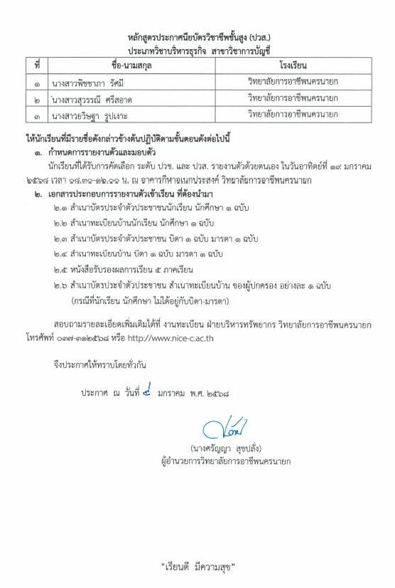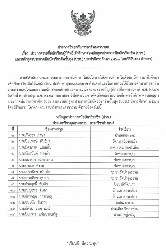 ประกาศวิทยาลัยการอาชีพนครนายก เรื่อง ประกาศรายชื่อนักเรียน นักศึกษา ผู้มีสิทธิ์เข้าศึกษาต่อหลักสูตรประกาศนียบัตรวิชาชีพ (ปวช.) และหลักสูตรระดับประกาศนียบัตรวิชาชีพชั้นสูง (ปวส.) ประจำปีการศึกษา 2568 โดยวิธีรับตรง “รอบโควตา” รอบ 2 โดยมีรายละเอียดตามเอกสารที่แนบมาพร้อมนี้
