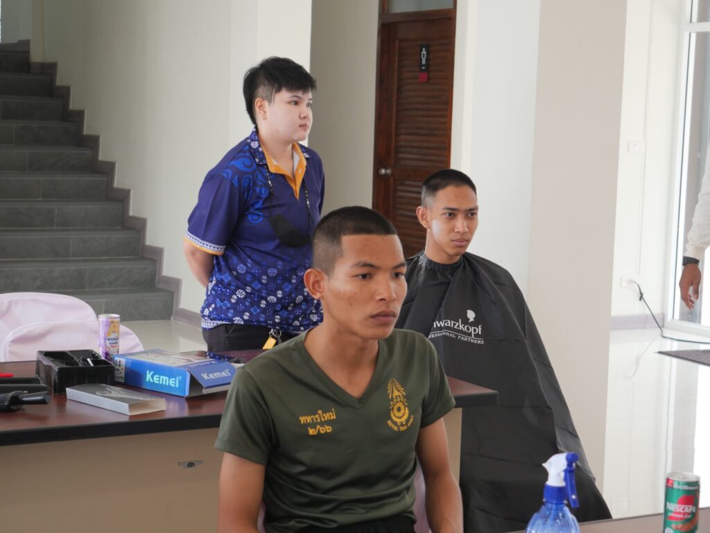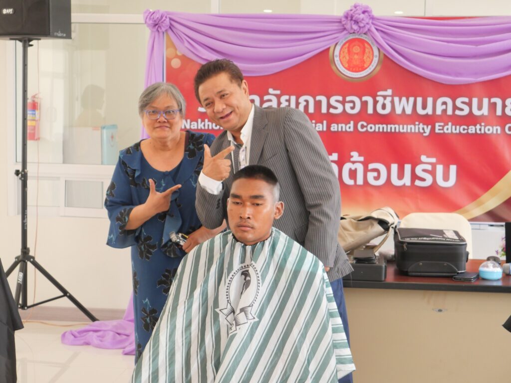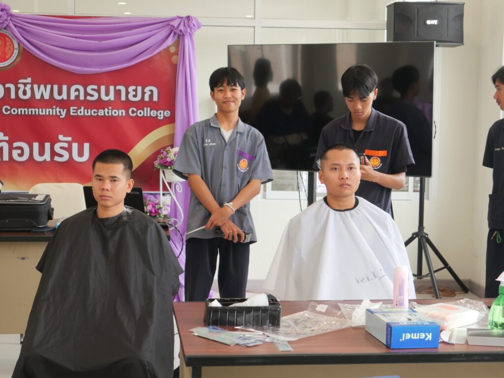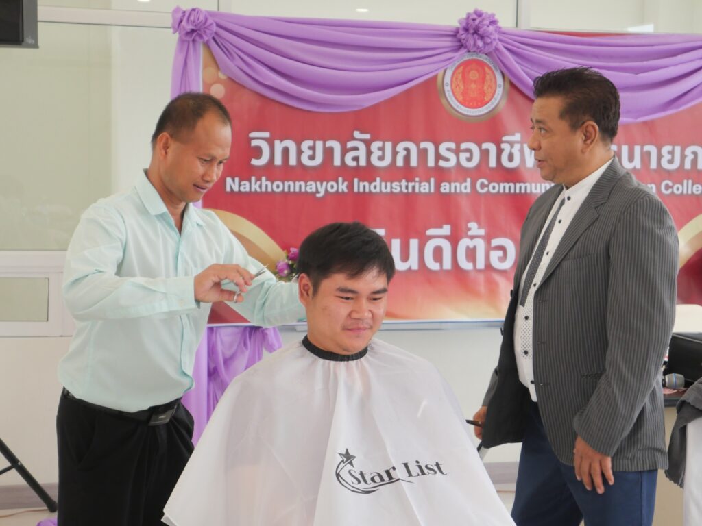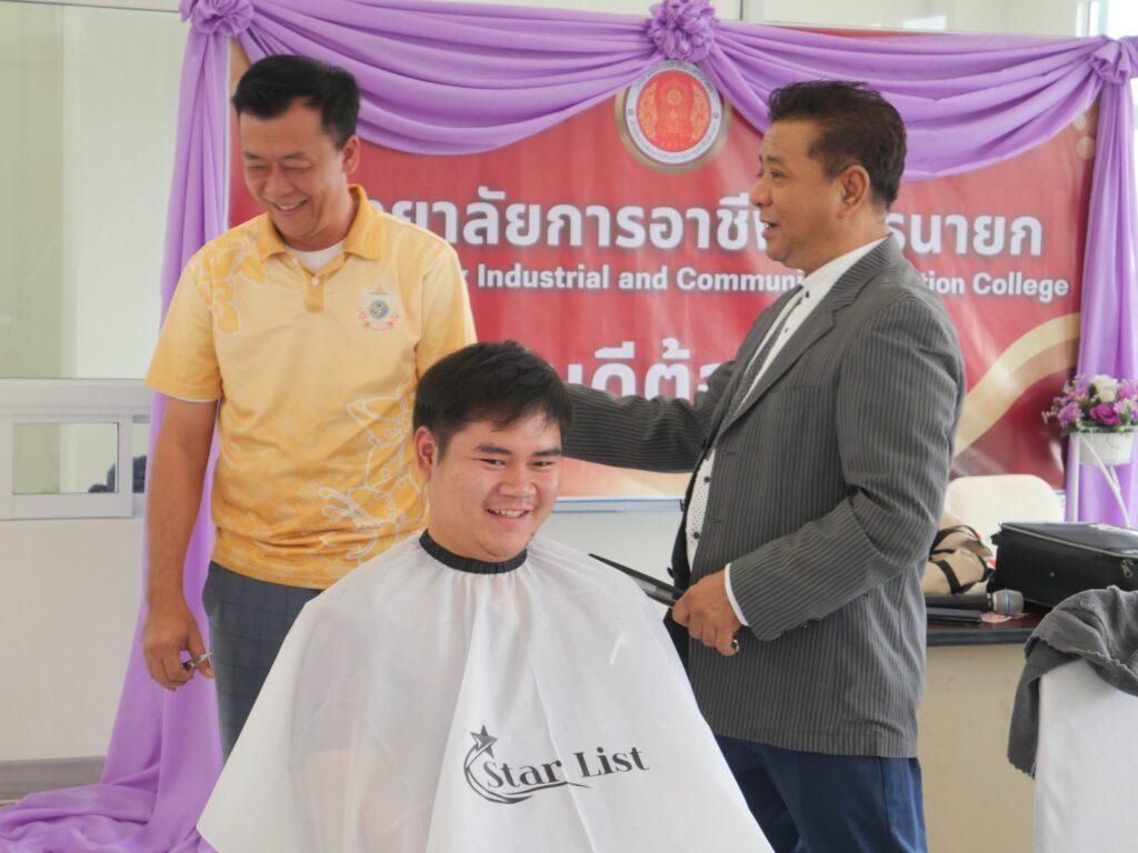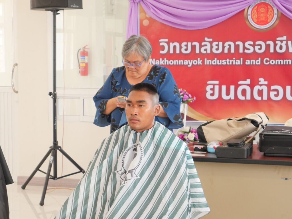 วันที่ 18 กุมภาพันธ์ 2568 นางศรัญญา สุขปลั่ง ผู้อำนวยการวิทยาลัยการอาชีพนครนายก พร้อมด้วย นางรติภัทร จันทร์ส่อง รองผู้อำนวยการฝ่ายพัฒนากิจการนักเรียน นักศึกษา นางพัชรินทร์ วิลัยโรจน์ หัวหน้างานอาชีวศึกษาระบบทวิภาคี คณะครู บุคลากรทางการศึกษา และนักเรียน นักศึกษา วิทยาลัยการอาชีพนครนายก เข้าร่วมโครงการขยายและยกระดับการจัดการอาชีวศึกษาระบบทวิภาคีคุณภาพสูง การอบรมเพิ่มสมรรถนะด้านบุคลิกภาพหลักสูตรตัดผมชายพื้นฐาน ในระหว่างวันที่ 17 – 21 กุมภาพันธ์ 2568 โดยในวันนี้ได้รับความอนุเคราะห์จากกองพันทหารราบ โรงเรียนนายร้อยพระจุลจอมเกล้า เป็นนายแบบในการตัดผมชายพื้นฐาน ณ วิทยาลัยการอาชีพนครนายก