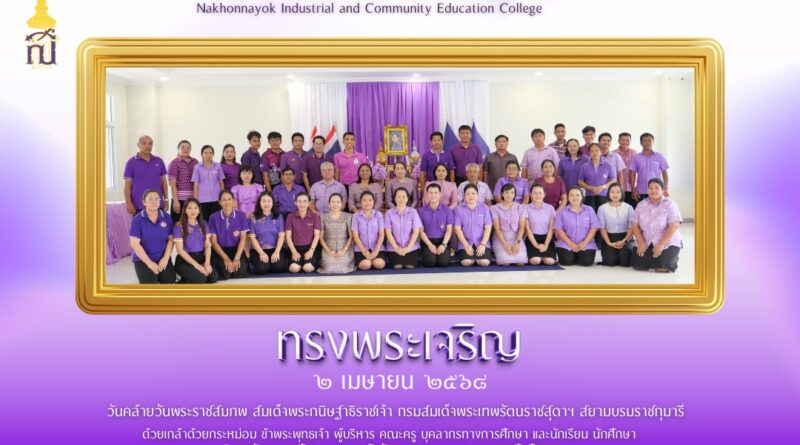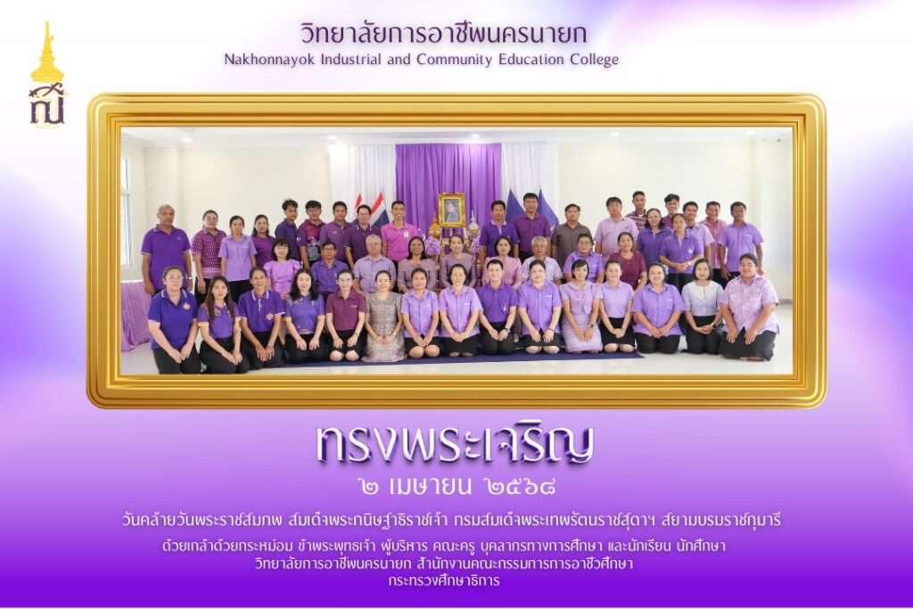 วันที่ 2 เมษายน 2568 นางศรัญญา สุขปลั่ง ผู้อำนวยการวิทยาลัยการอาชีพนครนายก พร้อมด้วย ผู้บริหาร คณะครู และบุคลากรทางการศึกษา วิทยาลัยการอาชีพนครนายก เข้าร่วมกิจกรรมวันคล้ายวันพระราชสมภพ สมเด็จพระกนิษฐาธิราชเจ้า กรมสมเด็จพระเทพรัตนราชสุดาฯ สยามบรมราชกุมารี ประจำปี 2568 (2 เมษายน 2568) ณ อาคารปาริชาติ ชั้น 2 วิทยาลัยการอาชีพนครนายก