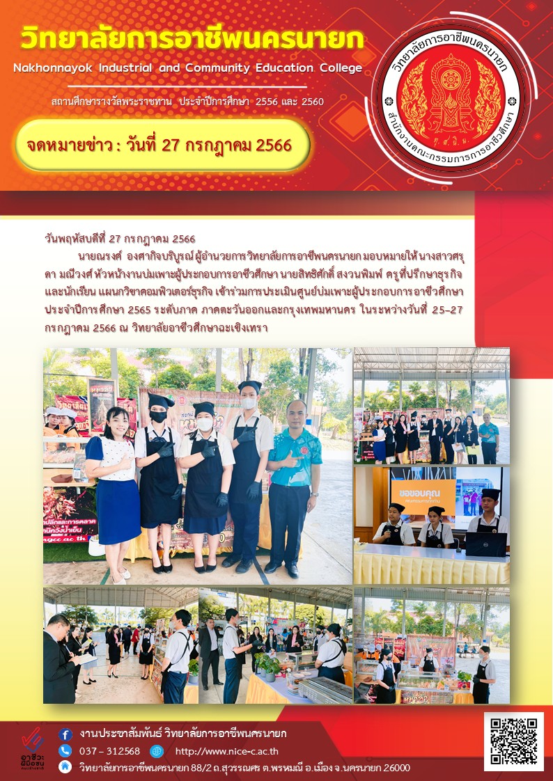 นายณรงค์ องศากิจบริบูรณ์ ผู้อำนวยการวิทยาลัยการอาชีพนครนายก มอบหมายให้ นางสาวศรุดา มณีวงศ์ หัวหน้างานบ่มเพาะผู้ประกอบการอาชีวศึกษา นายสิทธิศักดิ์ สงวนพิมพ์ ครูที่ปรึกษาธุรกิจ และนักเรียน แผนกวิชาคอมพิวเตอร์ธุรกิจ เข้าร่วมการประเมินศูนย์บ่มเพาะผู้ประกอบการอาชีวศึกษา ประจำปีการศึกษา 2565 ระดับภาค ภาคตะวันออกและกรุงเทพมหานคร ในระหว่างวันที่ 25–27 กรกฎาคม 2566 ณ วิทยาลัยอาชีวศึกษาฉะเชิงเทรา