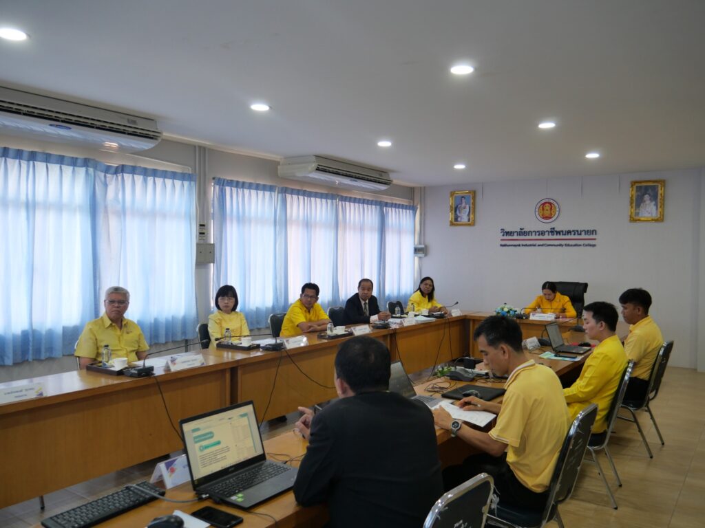นางศรัญญา สุขปลั่ง ผู้อำนวยการวิทยาลัยการอาชีพนครนายก พร้อมด้วย นางสาวปานรดา มุ่งยุทธกลาง รองผู้อำนวยการฝ่ายบริหารทรัพยากร ผู้ทรงคุณวุฒิ และคณะกรรมการ ในการประเมินการเตรียมความพร้อมและพัฒนาอย่างเข้ม ตำแหน่งครูผู้ช่วย ครั้งที่ 4 จำนวน 4 ท่าน นายพิทักษ์ สุขสว่างจิต ครูแผนกวิชาช่างกลโรงงาน นายพลวัฒน์ วงษ์ถวิล ครูแผนกวิชาช่างยนต์ นายไชยวัฒน์ อุ่นชื่น ครูแผนกวิชาช่างเชื่อมโลหะ และนายธันยวัฒน์ เชิญแก้ว ครูแผนกวิชาสามัญสัมพันธ์ กลุ่มวิชาภาษาไทย ณ ห้องประชุมจันทร์กระจ่างฟ้า อาคารตึกอำนวยการ ชั้น 2 วิทยาลัยการอาชีพนครนายก
