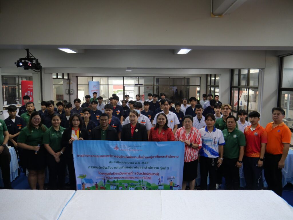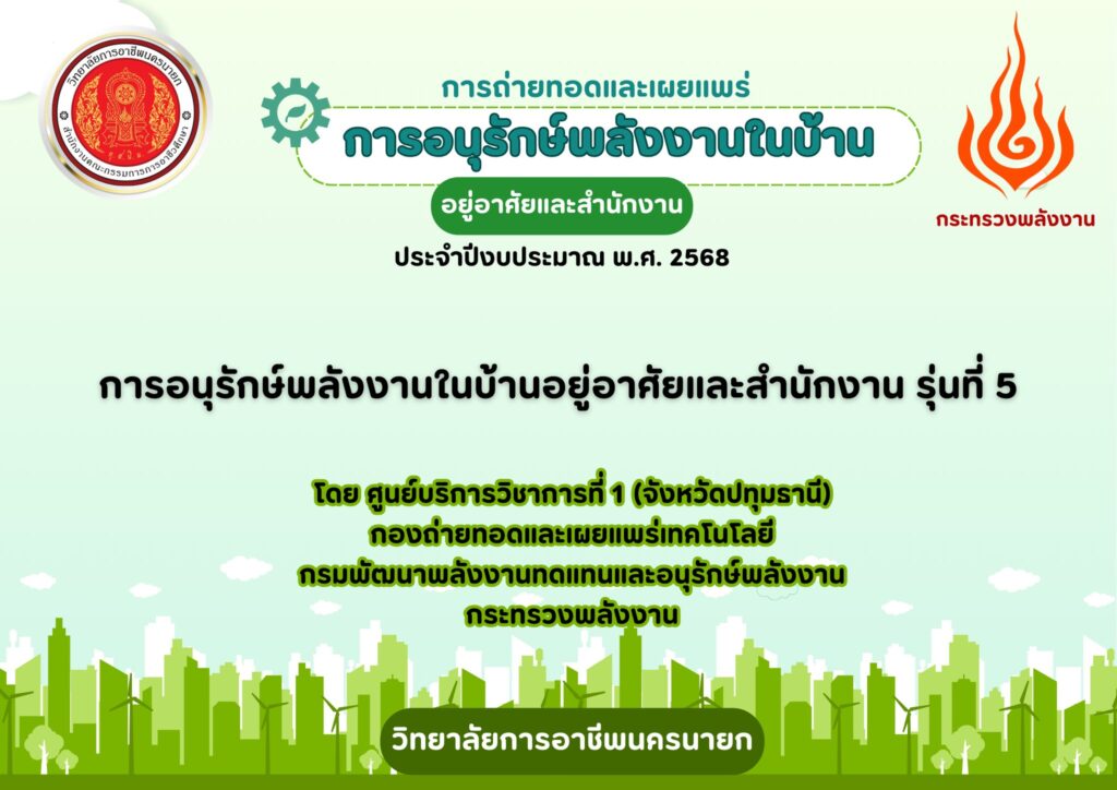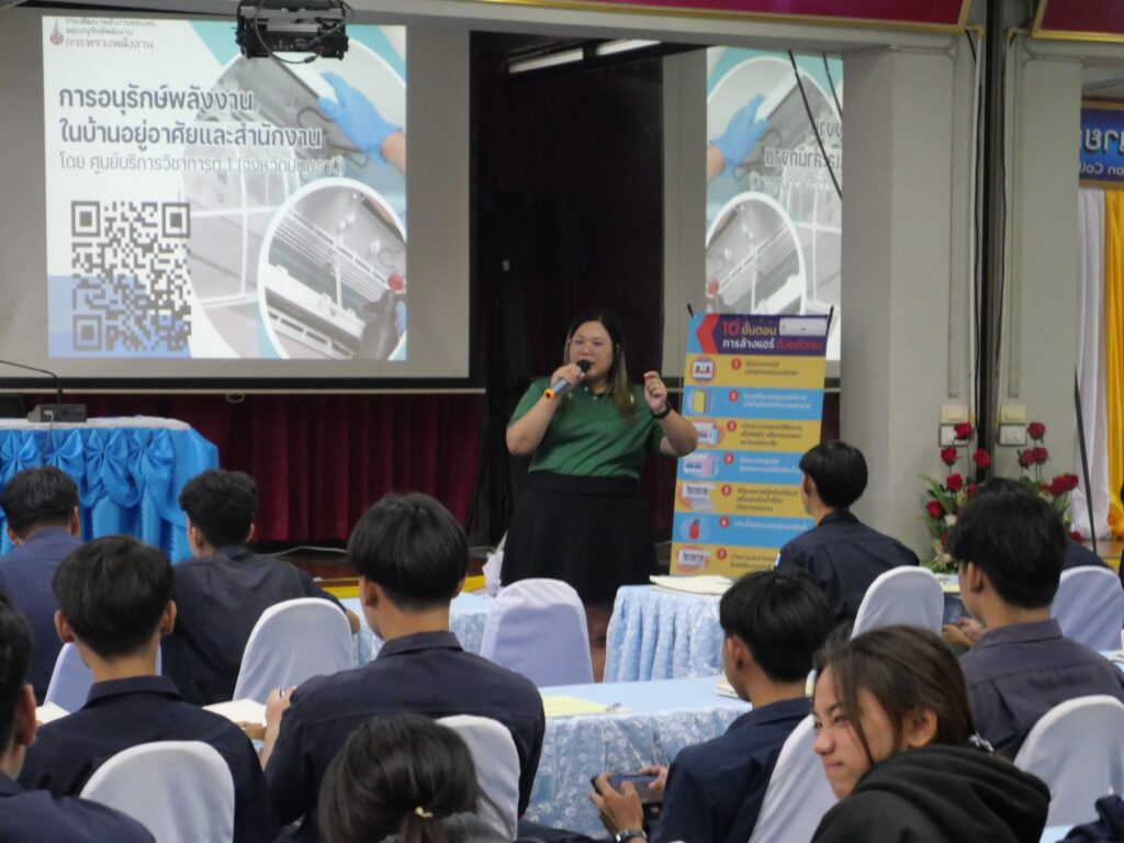 วันที่ 21 พฤษภาคม 2568 นางศรัญยา สุขปลั่ง ผู้อำนวยการวิทยาลัยการอาชีพนครนายก พร้อมด้วย นางสาวปานรดา มุ่งยุทธกลาง รองผู้อำนวยการฝ่ายวิชาการ นางรติภัทร จันทร์ส่อง รองผู้อำนวยการฝ่ายพัฒนากิจการ นักเรียน นักศึกษา นายเพชรดี แสงทอง ครูผู้ประสานงานพลังงาน คณะครู และนักเรียน นักศึกษา แผนกวิชาช่างไฟฟ้ากำลังและแผนกวิชาช่างอิเล็กทรอนิกส์ เข้าร่วมการอบรมการถ่ายทอดและเผยแพร่การอนุรักษ์พลังงานในบ้านอยู่อาศัยและสำนักงาน ประจำปีงบประมาณ พ.ศ. 2568 โดย ศูนย์บริการวิชาการที่ 1 (จังหวัดปทุมธานี) กองถ่ายทอดและเผยแพร่เทคโนโลยี กรมพัฒนาพลังงานทดแทนและอนุรักษ์พลังงาน กระทรวงพลังงาน ณ ห้องประชุมเฟรนคอนเนอร์ อาคารวิทยบริการ วิทยาลัยการอาชีพนครนายก