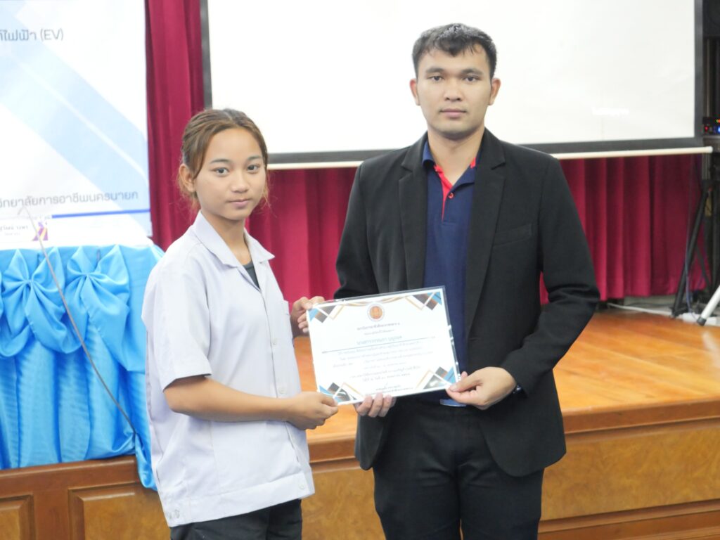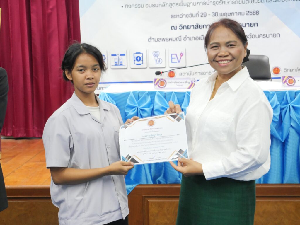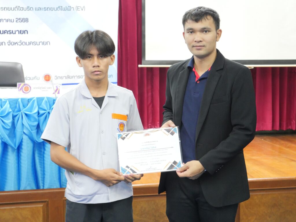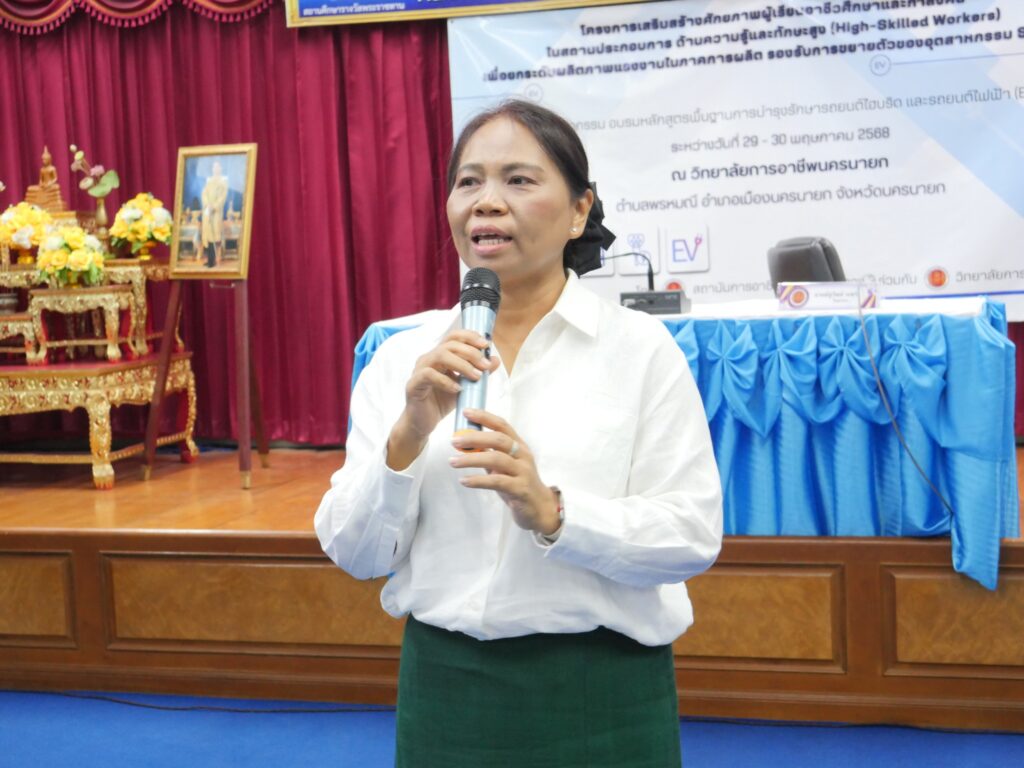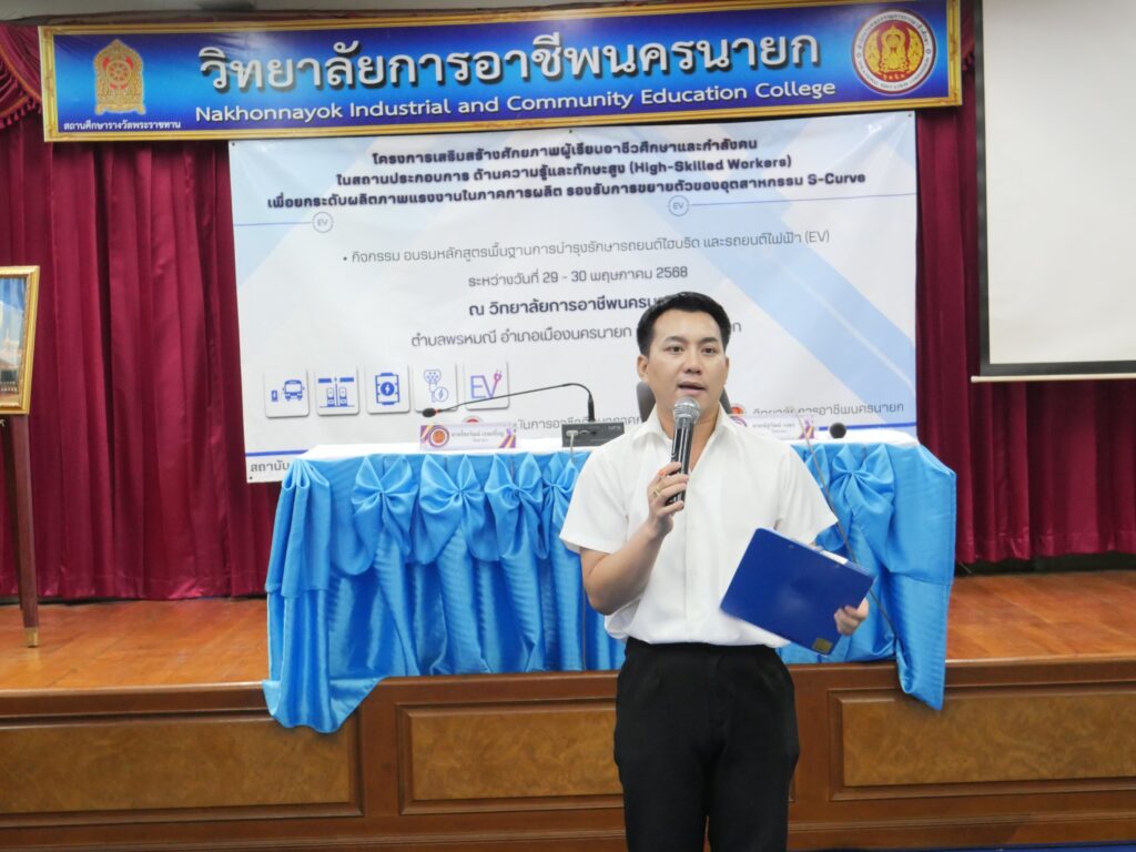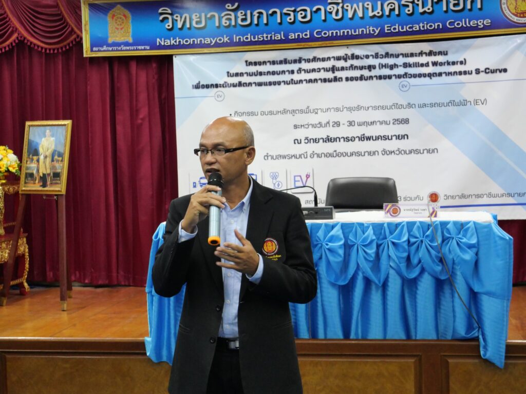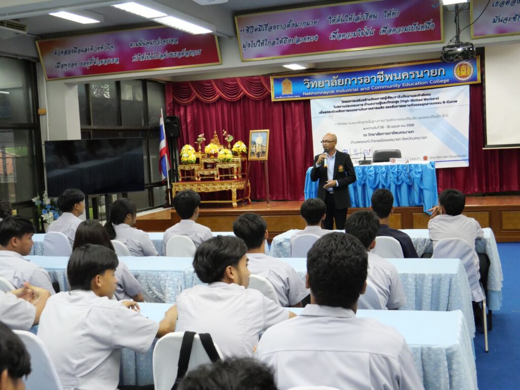 วันที่ 30 พฤษภาคม 2568 นางศรัญญา สุขปลั่ง ผู้อำนวยการวิทยาลัยการอาชีพนครนายก พร้อมด้วย ผู้บริหาร คณะครู และนักศึกษา แผนกวิชาช่างยนต์ แผนกวิชาช่างไฟฟ้ากำลัง และแผนกวิชาช่างอิเล็กทรอนิกส์ วิทยาลัยการอาชีพนครนายก เข้าร่วมโครงการเสริมสร้างศักยภาพผู้เรียนอาชีวศึกษาและกำลังคนในสถานประกอบการด้านความรู้และทักษะสูง (High-Skilled Workers) เพื่อยกระดับผลิตภาพแรงงานในภาคการผลิตรองรับขยายตัวของอุสาหกรรม S-Curve โดยมีนายอนันต์ พิมพ์โต่ง ผู้อำนวยการสำนักพัฒนายุทธศาสตร์และความร่วมมืออาชีวศึกษา สถาบันการอาชีวศึกษาภาคกลาง 3 เป็นประธานในพิธีปิด ณ ห้องประชุมเฟรนคอนเนอร์ อาคารวิทยบริการ วิทยาลัยการอาชีพนครนายก
