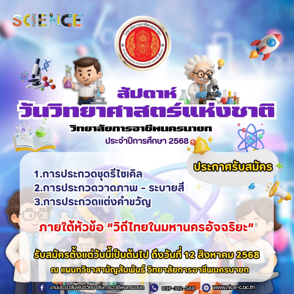 แผนกวิชาสามัญสัมพันธ์ วิทยาลัยการอาชีพนครนายก ขอเชิญชวนนักเรียนนักศึกษาร่วมส่งผลงานเข้าประกวด ในกิจกรรมโครงการ “วันวิทยาศาสตร์” ประจำปีการศึกษา 2568