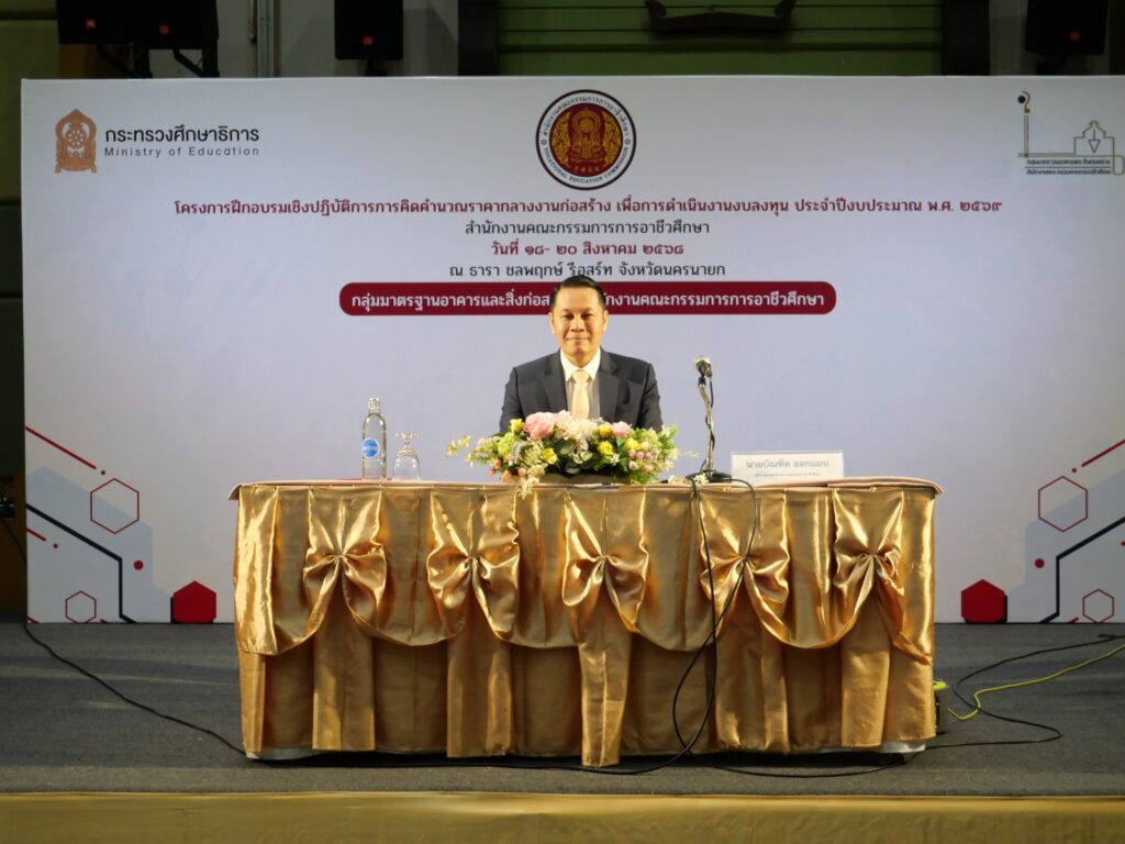 วันที่ 18 สิงหาคม 2568 นางศรัญญา สุขปลั่ง ผู้อำนวยการวิทยาลัยการอาชีพนครนายก พร้อมด้วย ผู้บริหาร คระครู บุคลากรทางการศึกษา วิทยาลัยการอาชีพนครนายก ร่วมเป็นคณะดำเนินงานร่วมกับกลุ่มมาตรฐานอาคารและสิ่งก่อสร้าง ในโครงการการฝึกอบรมเชิงปฏิบัติการการคิดคำนวณราคากลางงานก่อสร้างในงบลงทุน ประจำปีงบประมาณ พ.ศ. 2569 โดยมีนายบัณฑิต ออกแมน ผู้อำนวยการสำนักนโยบายและแผนการอาชีวศึกษา เป็นประธานในพิธีเปิด ณ ห้องประชุมราชพฤกษ์ 1 – 2 ชลพฤกษ์ รัสอร์ท จังหวัดนครนายก