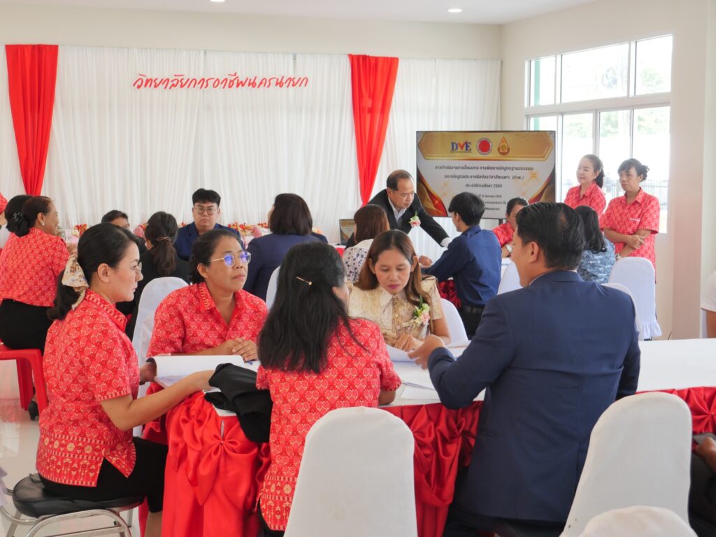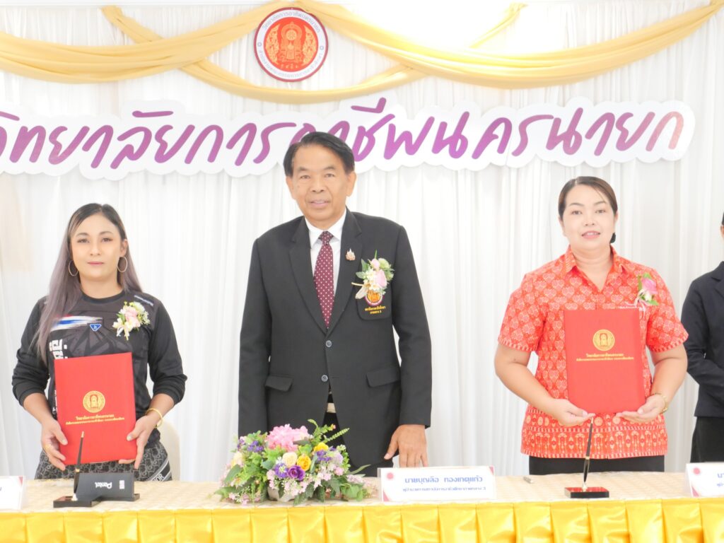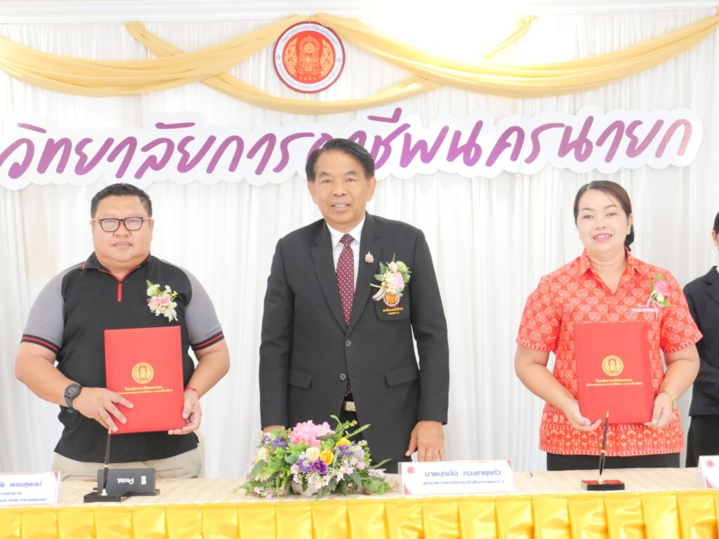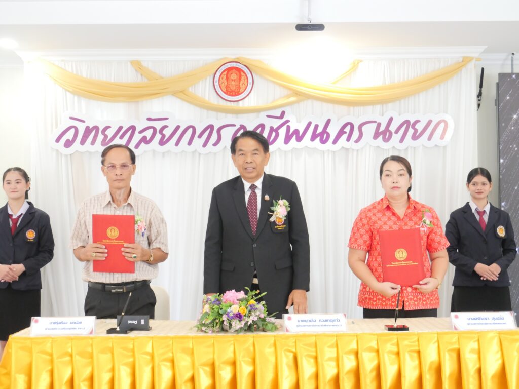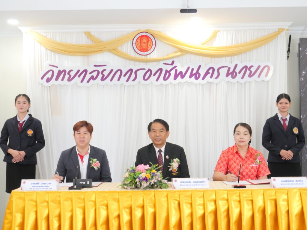 วันที่ 21 สิงหาคม 2568 นางศรัญญา สุขปลั่ง ผู้อำนวยการวิทยาลัยการอาชีพนครนายก พร้อมด้วย ผู้บริหาร คณะครู บุคลากรทางการศึกษา และนักเรียน นักศึกษา วิทยาลัยการอาชีพนครนายก ร่วมพิธีลงนามบันทึกข้อตกลงร่วมมือบันทึกข้อตกลงทางวิชาการเพื่อการจัดการศึกษาด้านอาชีวศึกษา ประจำปี 2568 โดยมี นายบุญลือ ทองเกตุแก้ว ผู้อำนวยการสถาบันการอาชีวศึกษาภาคกลาง 3 เป็นประธานในพิธี ณ ห้องประชุมปาริชาติ ชั้น 2 อาคารปาริชาติ