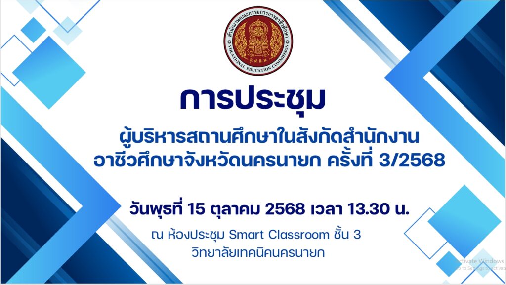 วันที่ 15 ตุลาคม 2568 นางศรัญญา สุขปลั่ง ผู้อำนวยการวิทยาลัยการอาชีพนครนายก พร้อมด้วย คณะผู้บริหาร วิทยาลัยการอาชีพนครนายก เข้าร่วมการประชุมผู้บริหารสถานศึกษาในสังกัดสำนักงานอาชีวศึกษาจังหวัดนครนายก ครั้งที่ 3/2568 ณ ห้องประชุม SmartClassroom วิทยาลัยเทคนิคนครนายก