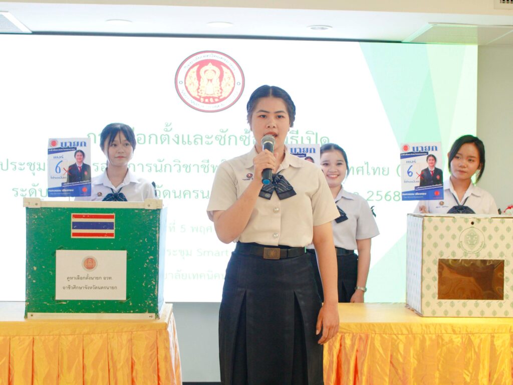 วันที่ 5 พฤศจิกายน 2568 ว่าที่ร้อยตรีเกษตร อ๊อกเวชะ ครูชำนาญการพิเศษ ทำหน้าที่รองผู้อำนวยการฝ่ายพัฒนากิจการนักเรียน นักศึกษา พร้อมด้วย นางสาวฐิติมา ไชยอาลา หัวหน้างานกิจกรรมนักเรียน นักศึกษา นายธันยวัฒน์ เชิญแก้ว ครูที่ ปรึกษา อวท. นายกองค์การฯ ประจำปี 2568 และ 2569 และเลขานุการ ประจำปี 2568 และ 2569 เข้าร่วมการเลือกตั้งและซักซ้อมพิธีเปิด งานประชุมวิชาการองค์การนักวิชาชีพในอนาคตแห่งประเทศไทย ระดับอาชีวศึกษาจังหวัดนครนายก ประจำปีการศึกษา 2568 ณ วิทยาลัยเทคนิคนครนายก