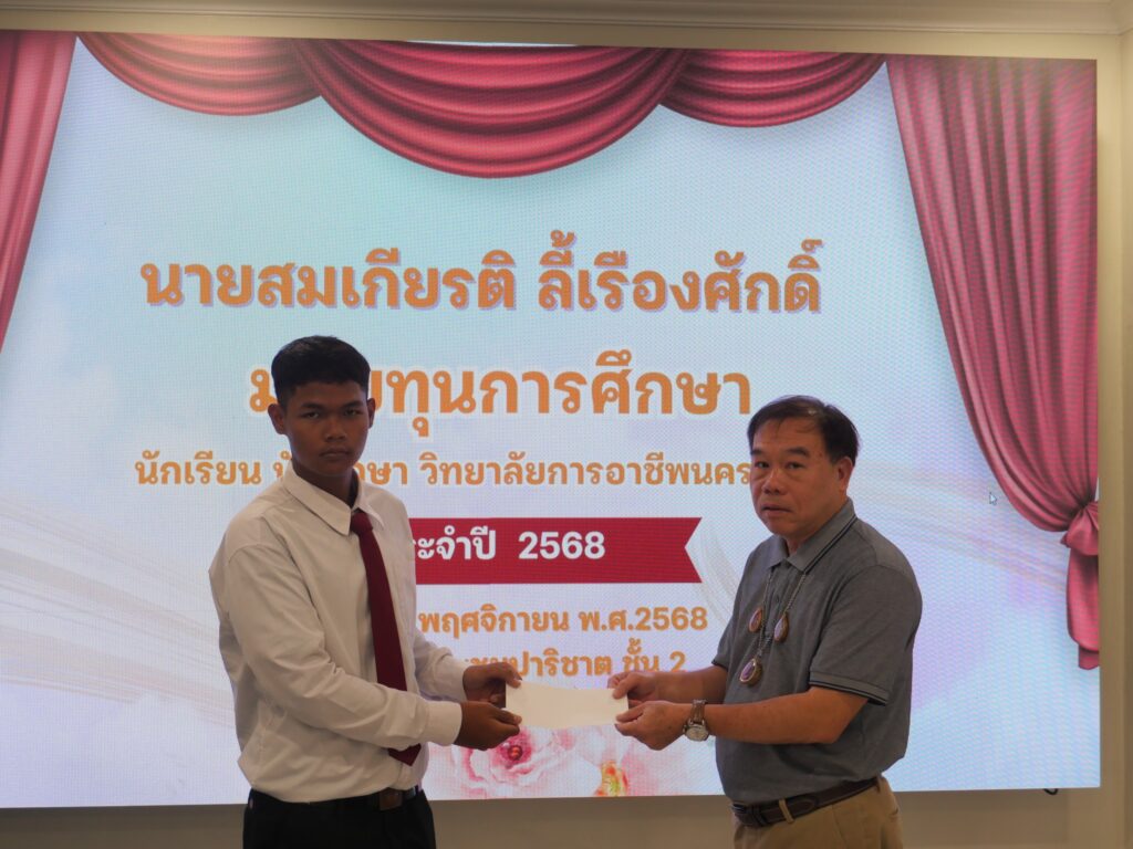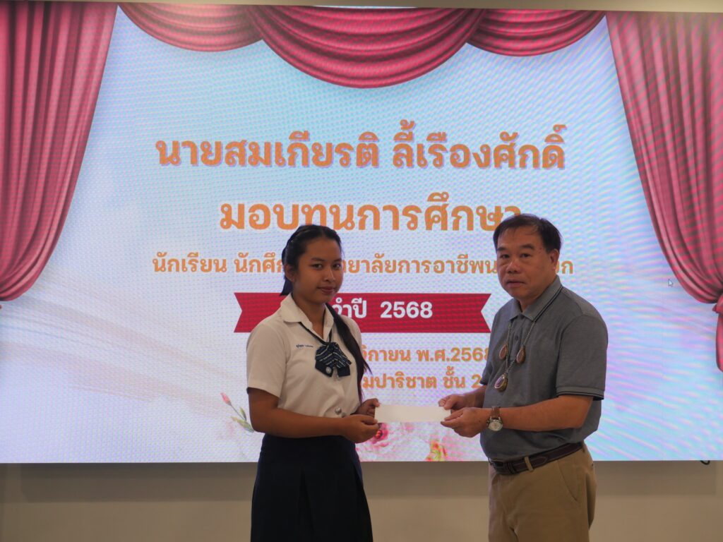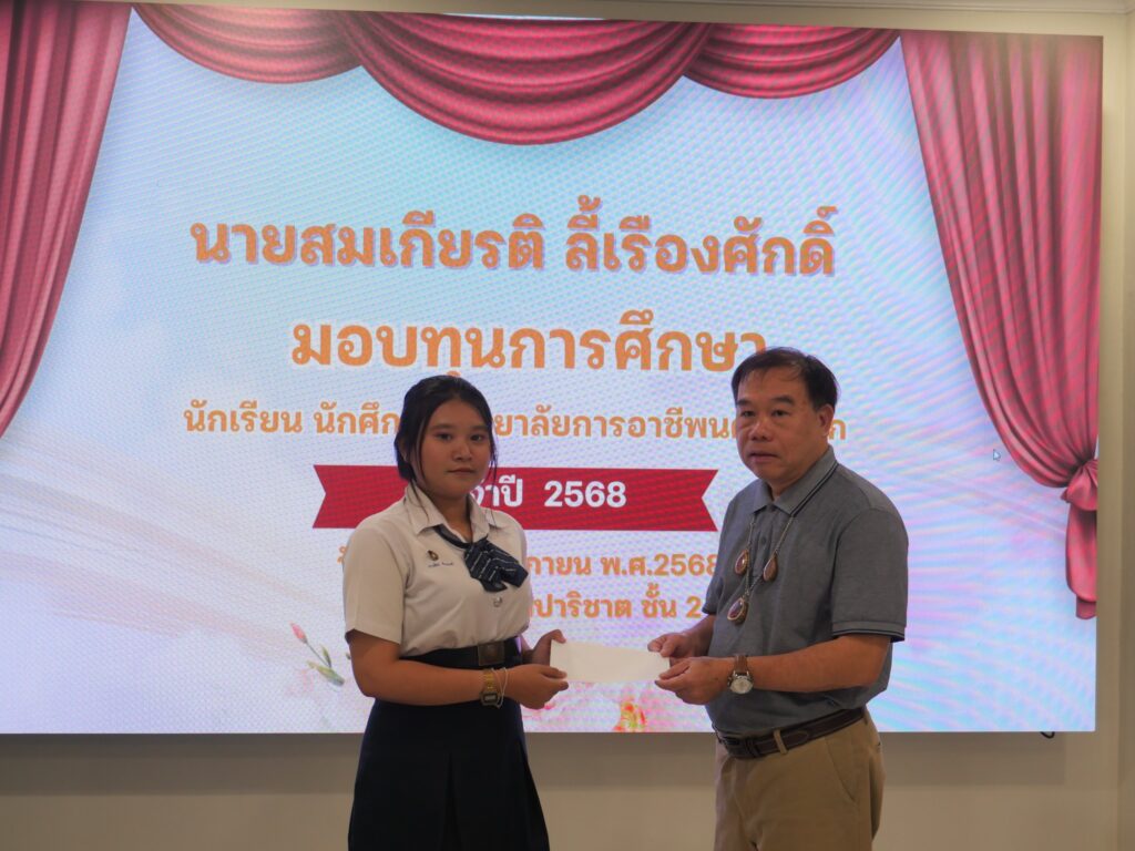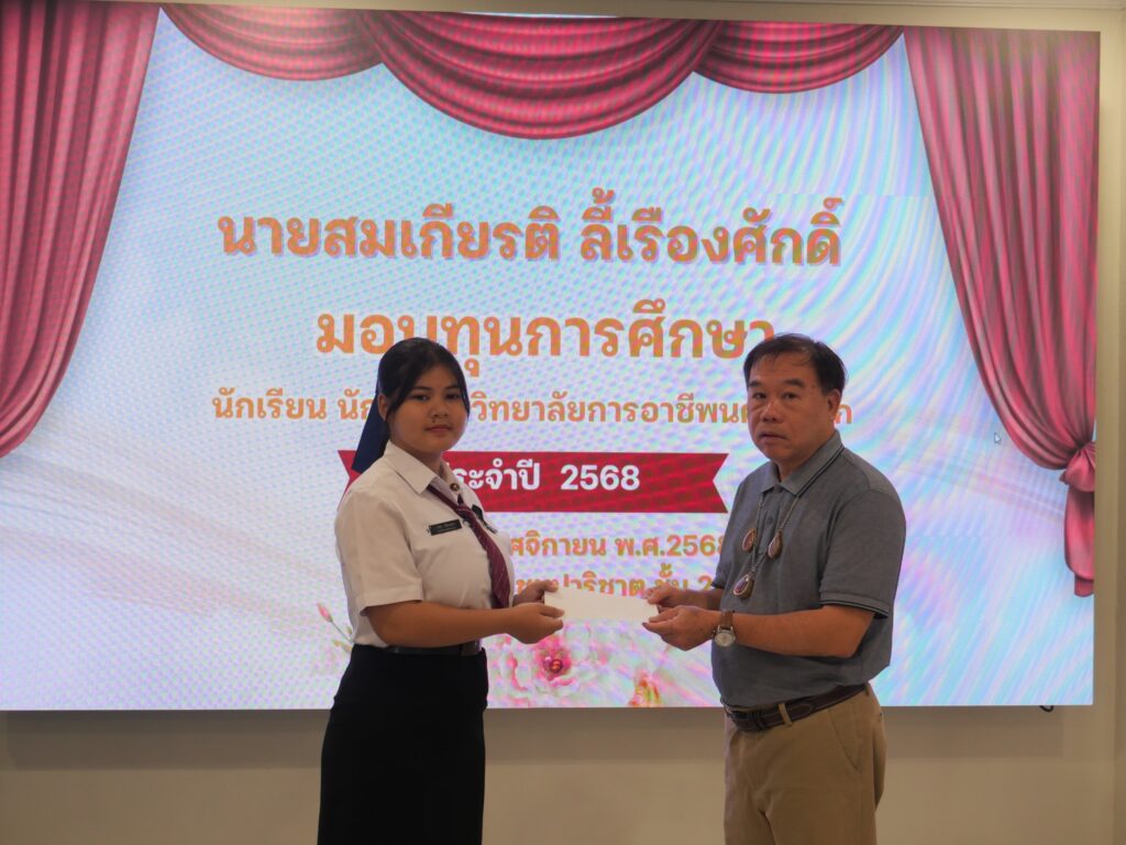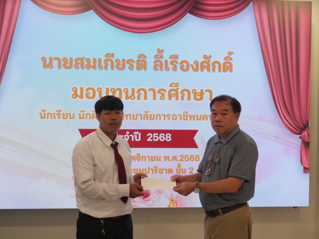 นที่ 13 พฤศจิกายน 2568 นางศรัญญา สุขปลั่ง ผู้อำนวยการวิทยาลัยการอาชีพนครนายก พร้อมด้วย คณะผู้บริหาร คณะครู นำนักเรียน นักศึกษา จำนวน 15 คน รับมอบทุนการศึกษา ประจำปีการศึกษา 2568 จำนวน 15 ทุน โดยคุณสมเกียรติ ลี้เรืองศักดิ์ ณ ห้องประชุมปาริชาติชั้น 2 อาคารปาริชาติ วิทยาลัยการอาชีพนครนายก