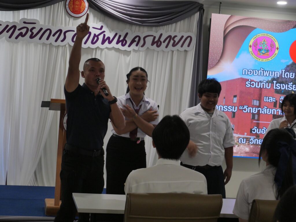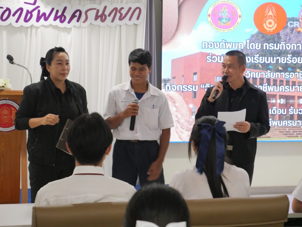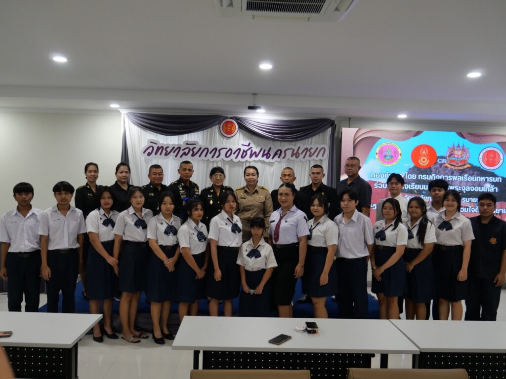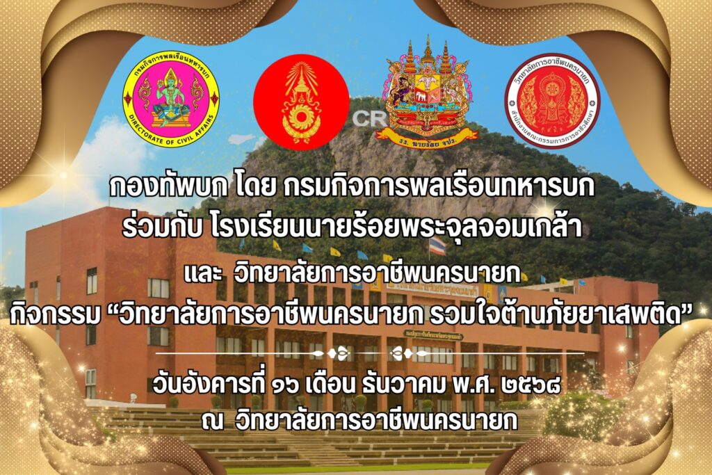 วันที่ 16 ธันวาคม 2568 นางศรัญญา สุขปลั่ง ผู้อำนวยการวิทยาลัยการอาชีพนครนายก พร้อมด้วย คณะผู้บริหาร คณะครู และนักเรียน นักศึกษา วิทยาลัยการอาชีพนครนายก เข้าร่วมกิจกรรม “วิทยาลัยการอาชีพนครนายก รวมใจต้านภัยยาเสพติด” กองทัพบก โดย กรมกิจการพลเรือนทหารบก ร่วมกับ โรงเรียนนายร้อยพระจุลจอมเกล้า และวิทยาลัยการอาชีพนครนายก ณ ห้องประชุมปาริชาติ ชั้น 2 อาคารปาริชาติ วิทยาลัยการอาชีพนครนายก